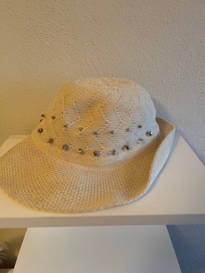 Bu beyaz örgü bohem şapka, boncuk detaylarıyla retro ve hippie tarzlarını birleştirir, hafif ve şık bir görünüm sunar.