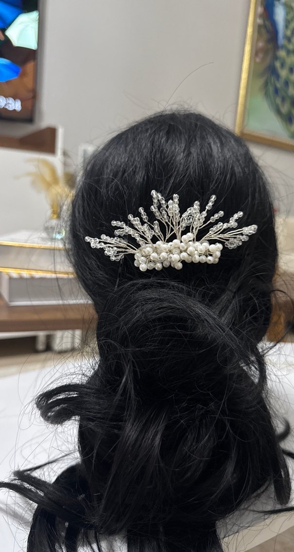 Boncuk ve inci detaylı beyaz saç tarağı, klasik zarafeti yansıtan örme dokunuşlarla süslenmiştir. ✨