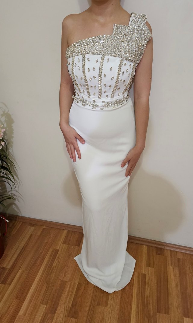 Boncuk Detaylı Beyaz Uzun Abiye Elbise