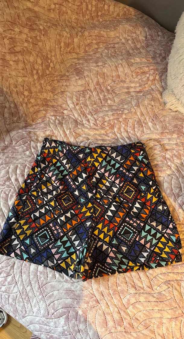 Boncuk detaylı, bol kesim mini şortlar, çok renkli bohem desenli, sentetik rahat kumaştan, dış mekan kullanımı için uygun.