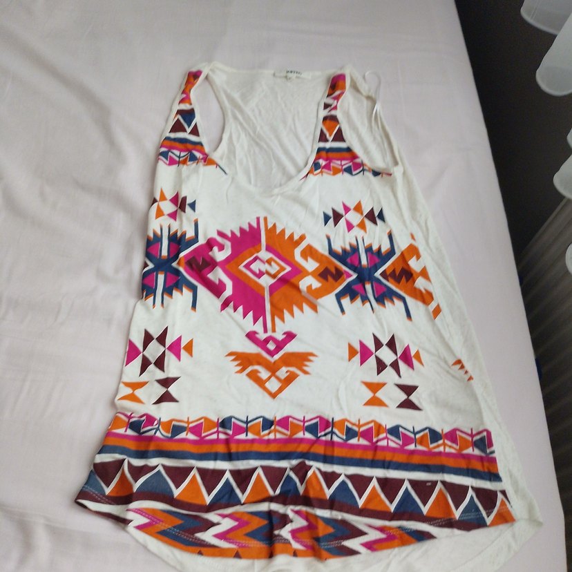 V yaka, boncuk detaylı ve bol kesim çok renkli bohem desenli, yumuşak dokulu kumaştan üretilmiş kolsuz atlet. Günlük kullanım için uygundur.