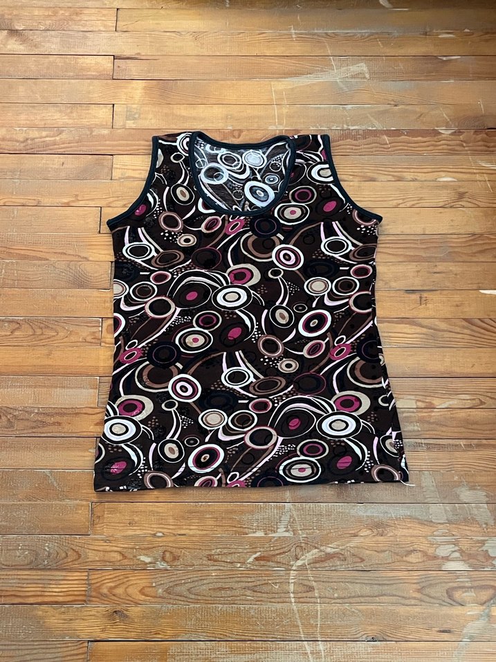 Boncuk detaylı, bohem tarzında, kolsuz ve tekne yakalı kadın atlet. Koyu tonlarda çok renkli batik desenli, yumuşak dokulu kumaştan, günlük kullanıma uygun.