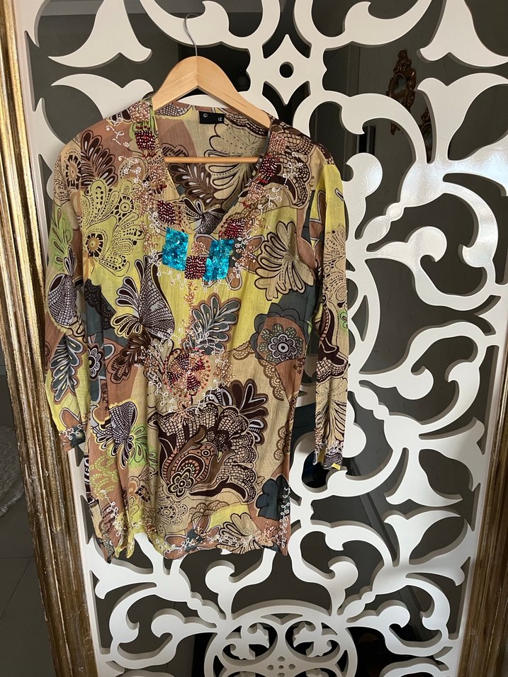 Boncuk detaylı, V yaka, uzun kollu, bol kesim çok renkli desenli bohem kadın tunik. Günlük kullanıma uygun rahat bir parça. Yazın mayo üzeride çok şık olur
