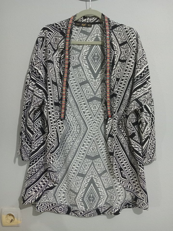 Gri renkli, desenli tekstil kumaştan yapılmış, uzun kollu ve bol kesim bohem kimono. V yaka ve boncuk detayları bulunur, günlük kullanıma uygundur. diğer ilanlarimda uygundur bakın isterseniz