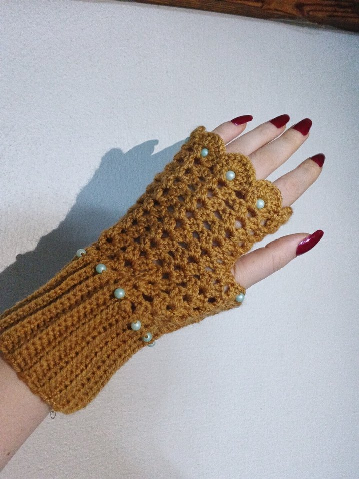 Bej renkli, boncuk detaylı ve açık örgü deseniyle bohem ve retro tarzda örgü eldiven. Rahat ve renkli bir görünüm sunar.