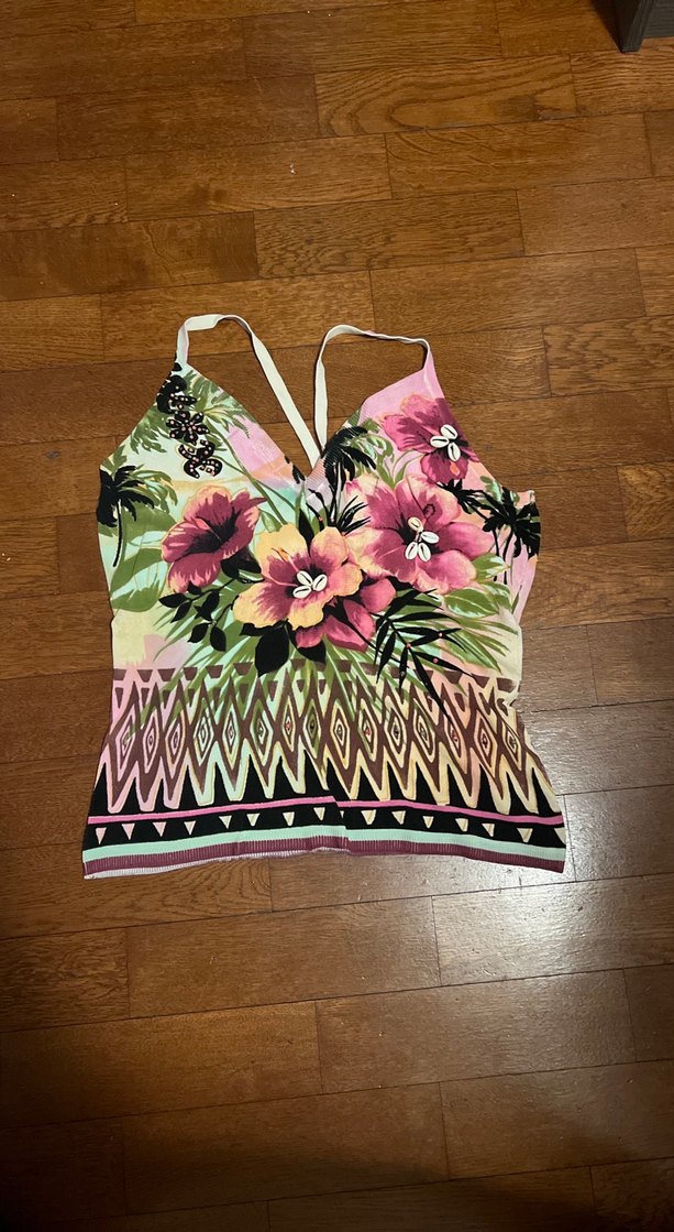 V yakalı, ince askılı, boncuk detaylı mini bluz. Pastel renkli çiçek desenli, yumuşak trikodan yapılmıştır,