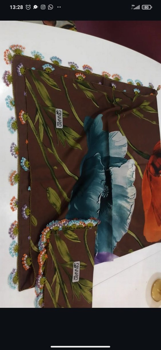 Kadınlar için boncuk detaylı, çok renkli ve koyu tonlarda çiçek desenli bohem tarzı fular. Hippie ve retro tarzlara uygundur.
