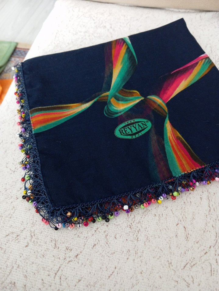 Boncuk işlemeli kenarları ve çok renkli deseniyle bohem tarzda kadın fularıdır. Üzerinde 'REYYAN' etiketi bulunur, retro ve hippie havası verir.