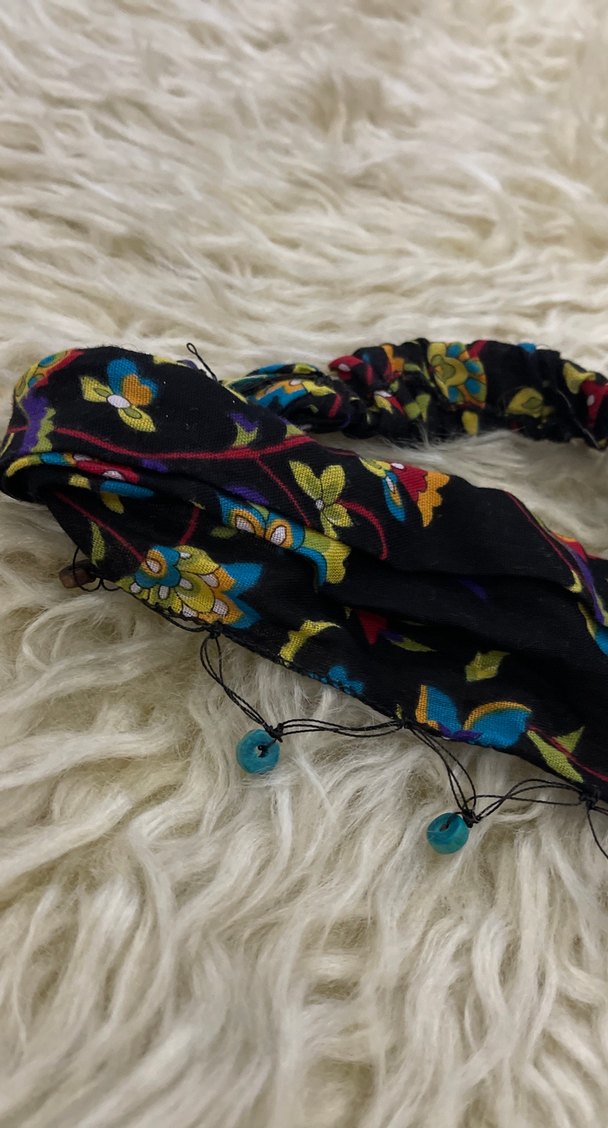 Boncuk detaylı, koyu çok renkli tekstil fular. Bohem tarzda, canlı çiçek desenleriyle retro ve hippie görünüm sağlar.