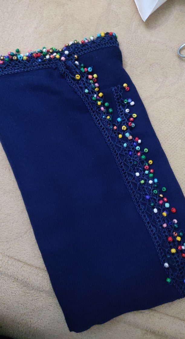 Bu kadın fularında çok renkli boncuk detayları bulunan koyu renkli tekstil kumaş kullanılmıştır. Bohem ve retro tarzı yansıtır.