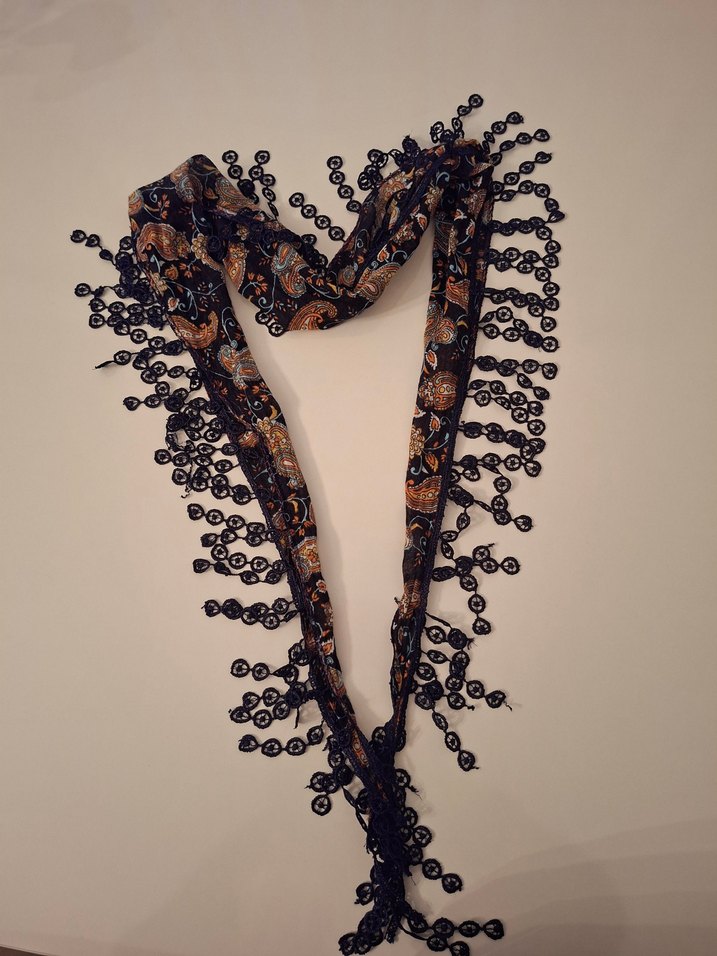 Koyu renkli, çok renkli tekstil şal, boncuklu kenar detayları ve bohem desenlere sahip. Hafif kumaşı kenarlarında zarif boncuk süslemeleri bulunur.