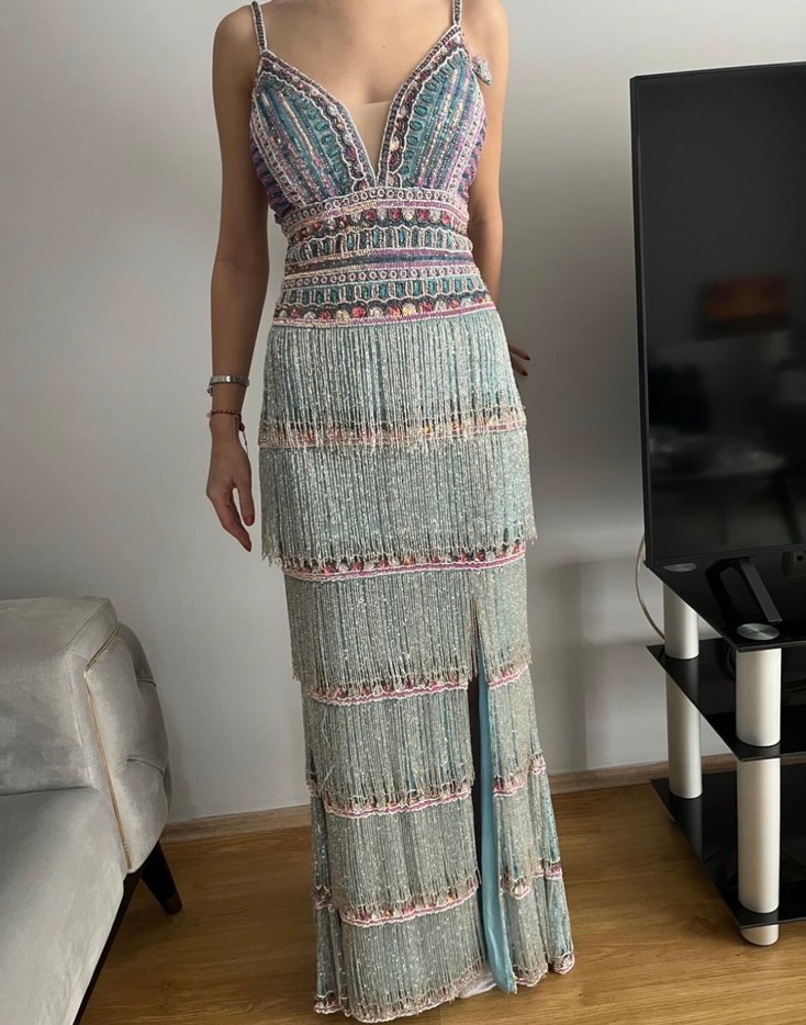 V yaka ve ince askılı, boncuk işlemeli, pastel tonlarda çok renkli bohem uzun elbise. Fit kesimi ile parti için uygun.