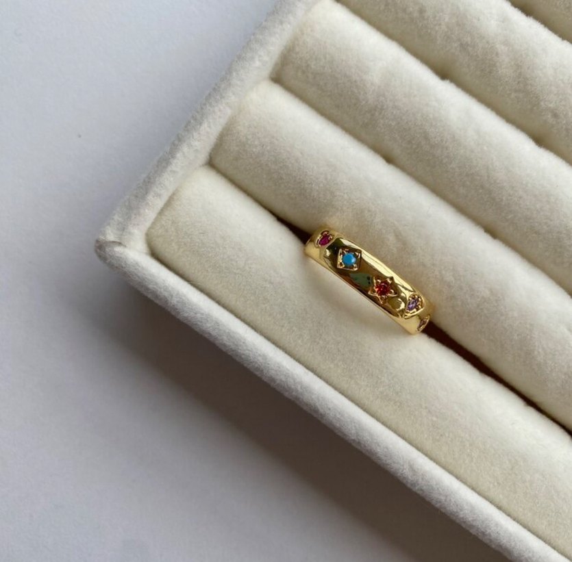 Altın renkli bant üzerinde çok renkli taşlarla boncuk detayı bulunan kadın yüzüğü, bohem tarzı ve romantik buluşmalar için uygun.