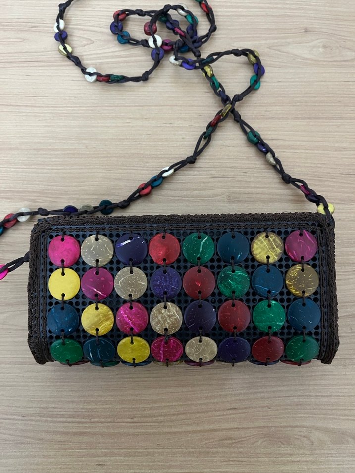 Bohem tarzda, örgü kumaştan yapılmış, boncuk detaylı ve çok renkli bağlama deseniyle süslenmiş kadın çantası. Uzun askılı, günlük kullanıma uygun.