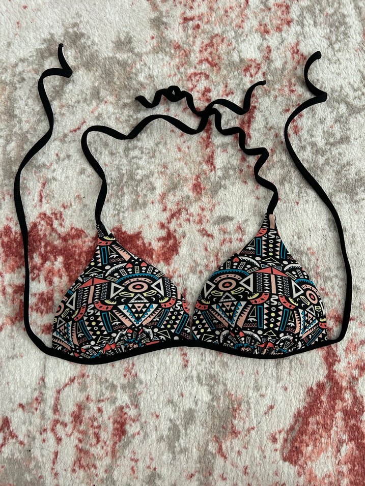 Boncuk detaylı, çok renkli ve desenli, ince askılı, bohem tarzda, vücuda oturan bikini üstü.