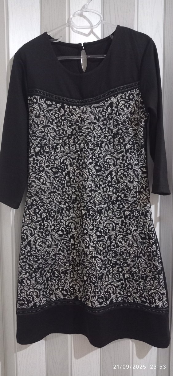 Boncuk detaylı, desenli, uzun tunik. V yaka ve dar kesim ile ofis için uygun, siyah ve beyaz tonlarda.BİR KAÇ KEZ GİYİLDİ YENİ GİBİ