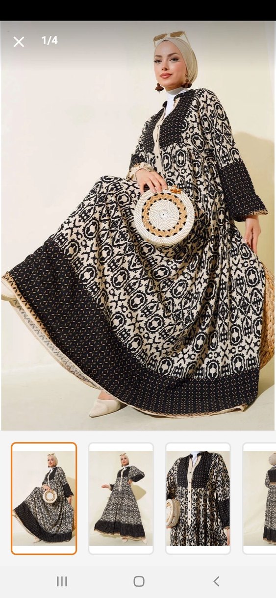 Boncuk detaylı, desenli uzun bohem elbise. Sentetik kumaştan, koyu renkli ve bol kesim. Kayık yaka ve ince askılı kollarıyla günlük kullanıma uygun.