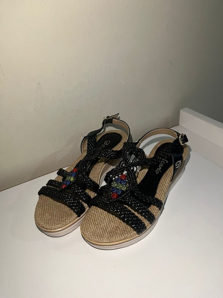Boncuklu, siyah örgü bantlı dolgu topuk kadın sandalet. Yılan desenli detaylarla bohem tarzını yansıtır. Kauçuk tabanlı, günlük kullanıma uygundur.