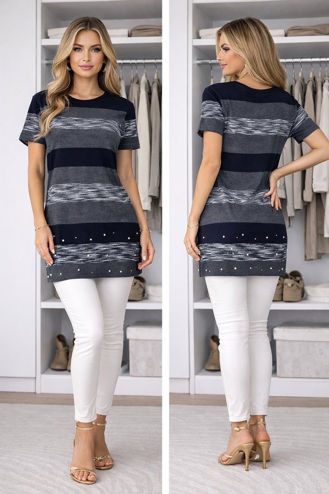 Gri kumaştan, batik desenli ve kısa kollu. Boncuk detaylı, midi boy ve regular fit kesim, günlük kullanım için uygun.