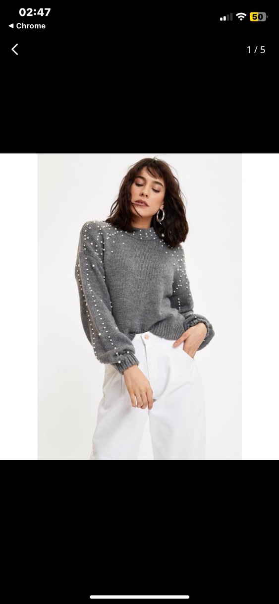 Gri triko kazak, uzun kollu ve yuvarlak yakalıdır, kol ve omuzlarda inci boncuk detayları bulunur. Bol kesim ve midi boyda, yumuşak triko malzemeden üretilmiştir. (marka temsilidir.) S ve M beden uyumludur.