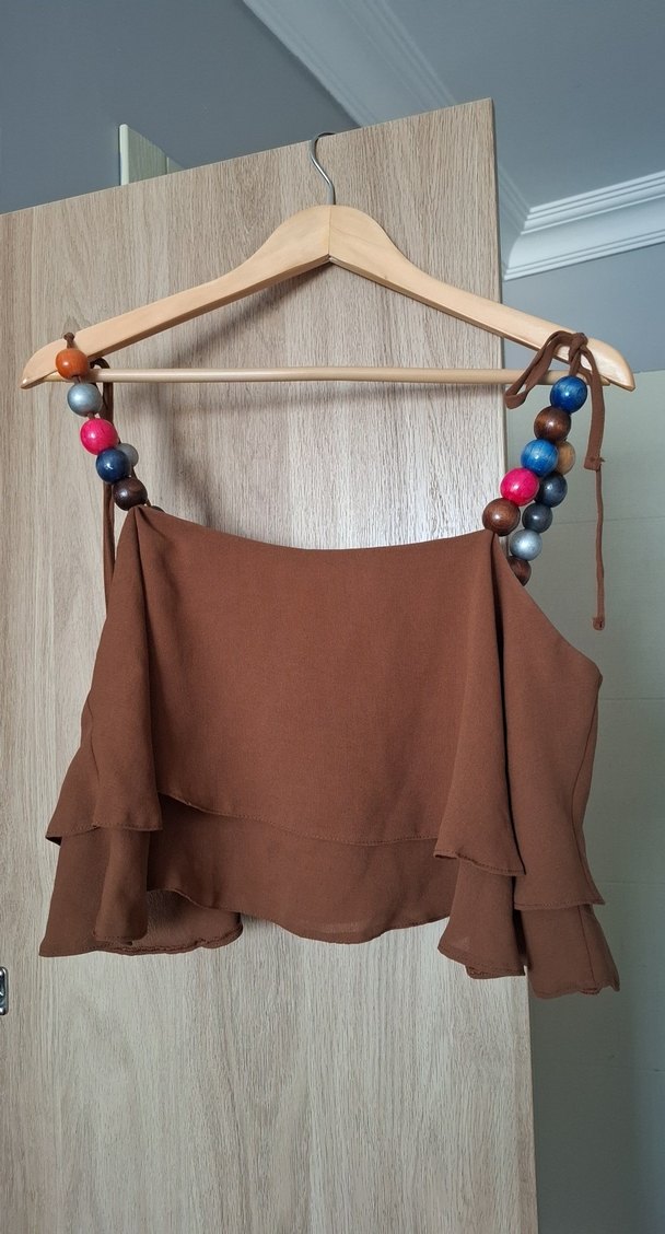 Boncuk detaylı askılı, kahverengi straplez bluz. Sentetik kumaştan, bol kesim ve kısa mini boyda, bohem tarz için uygun.
