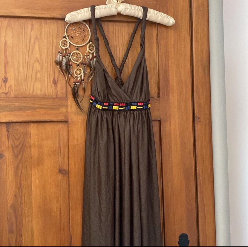Kahverengi, boncuk detaylı, etnik desenli, askılı uzun bohem elbise. Salaş kesimi ve halter yaka ile parti için uygun.