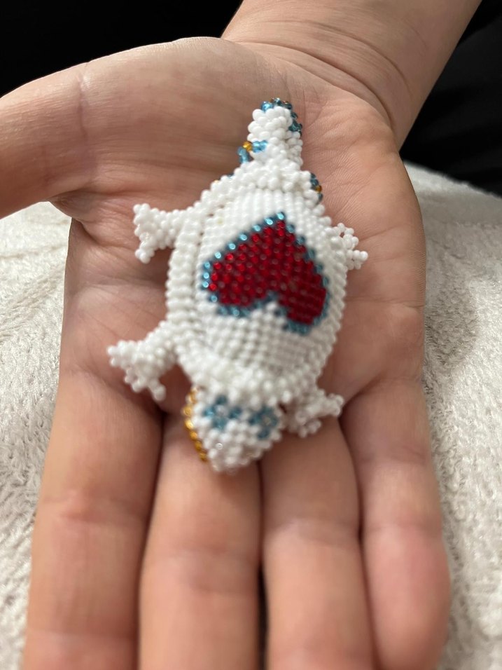 Renkli boncuklarla işlenmiş, beyaz zemin üzerinde kırmızı kalp detaylı kaplumbaga anahtarlık, bohem ve avangart tarzı yansıtıyor.