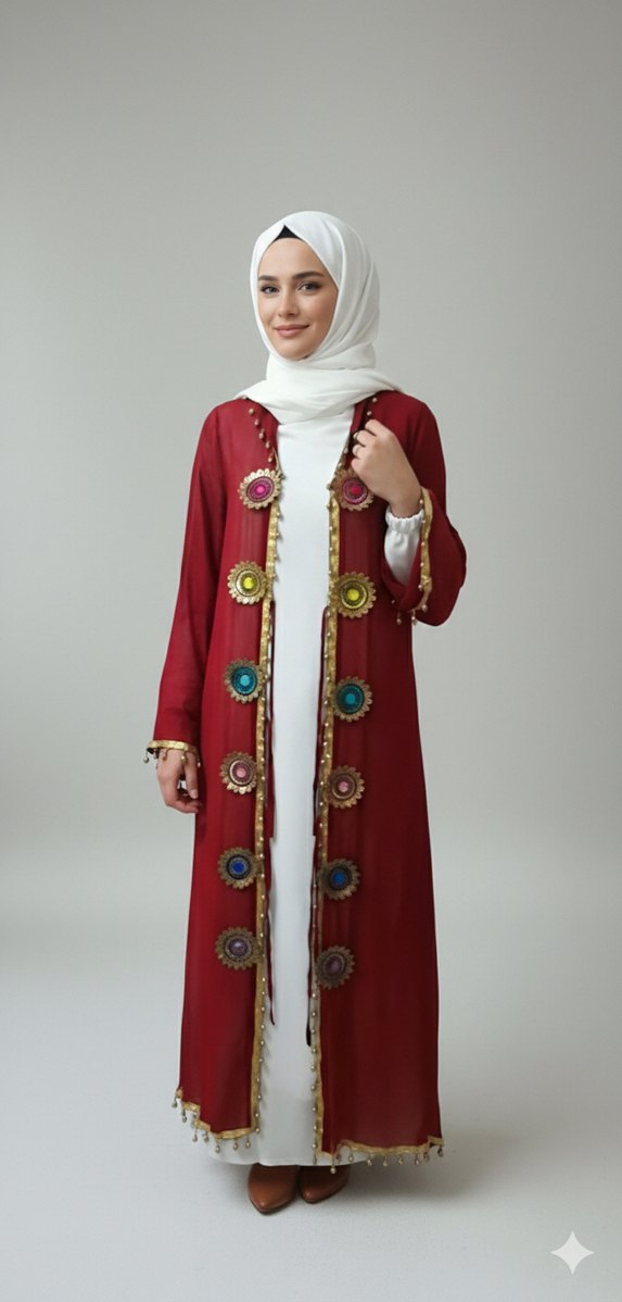 Boncuk Detaylı Kırmızı Tesettür Hint Elbisesi