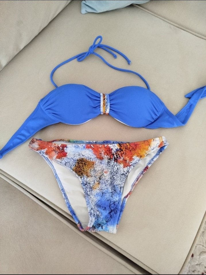 Canlı mavi bağlamalı üst ve renkli tie-dye alt parçalı, boncuk detaylı kadın bikini. İnce askılı, mini kesim, plaj için uygun.