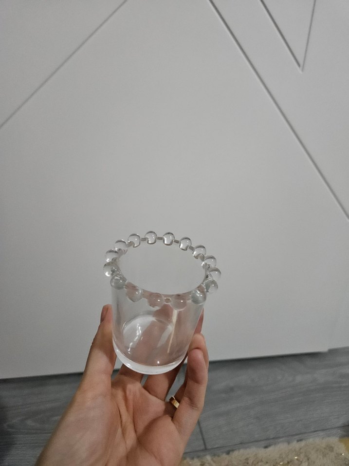 Kenarında boncuk detayları bulunan küçük, şeffaf cam bardak. Küçük içecekler için uygundur.
