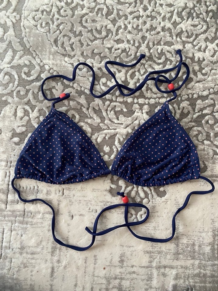 Lacivert puantiyeli, boncuk detaylı ve ince askılı, bohem tarzda, plaj için uygun fitted bikini üstü. ️M L beden.