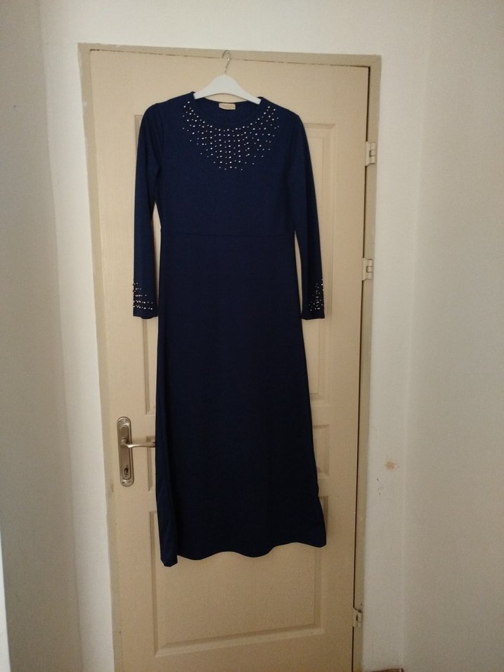 Lacivert renkli, uzun kollu, elbise. boncuk işlemeli, dar kesim uzun elbisedir. Minimalist ve sade tasarıma sahiptir.
