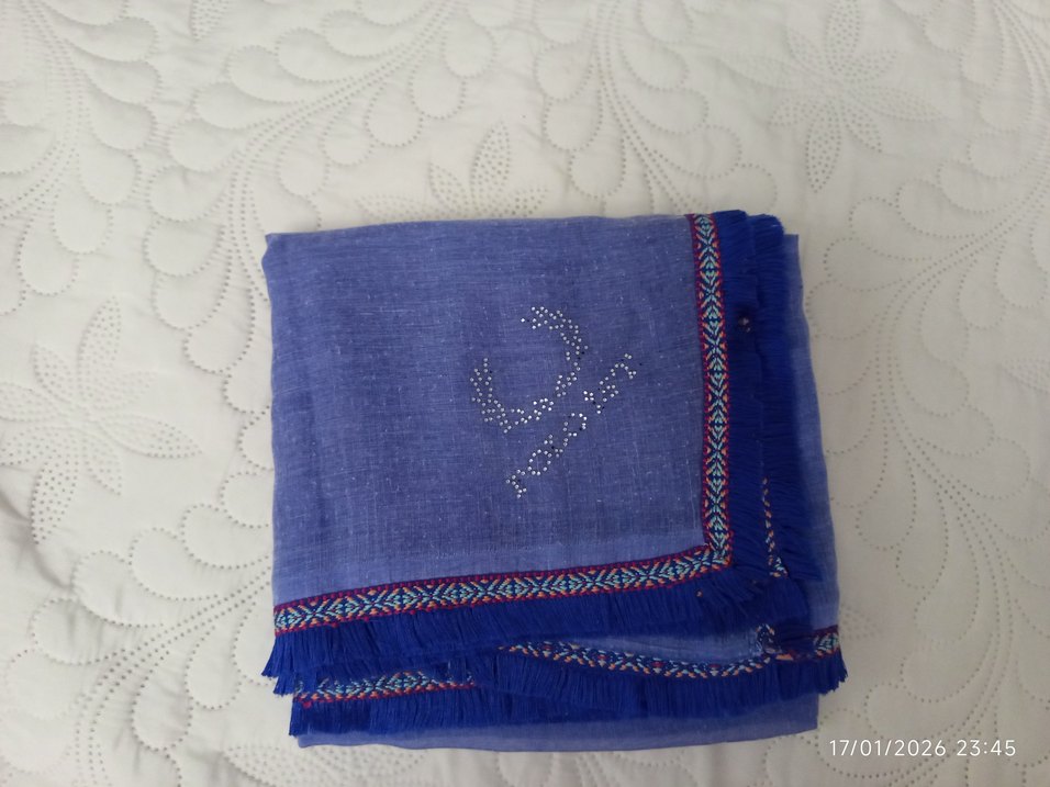 Boncuk işlemeli mavi tekstil şal, desenli kenarları ve püskülleriyle bohem tarzını yansıtıyor. Yumuşak kumaş ve retro dokunuşlar içerir.