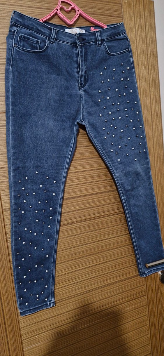 Parlak boncuk işlemeli, mavi kot kumaştan, dar kesim midi uzunlukta günlük kullanıma uygun kadın kot pantolon.