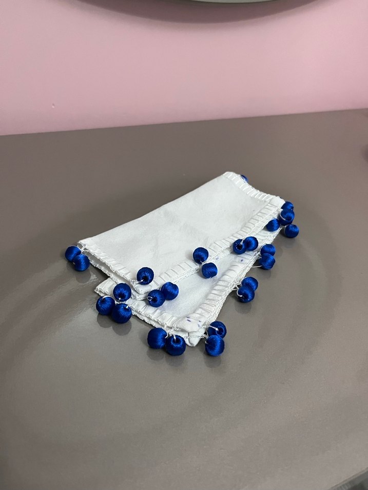 Mavi tekstilden yapılmış, boncuk detaylı kenarları olan, minimalist ve sade tarzda kadın şalı. İki adet sunum peçetesi