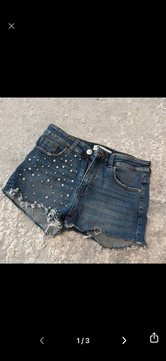 Boncuk ve nakış detaylı, yırtık kenarlı mini denim şort. Günlük rahat sokak stili için uygun, dar kesim.