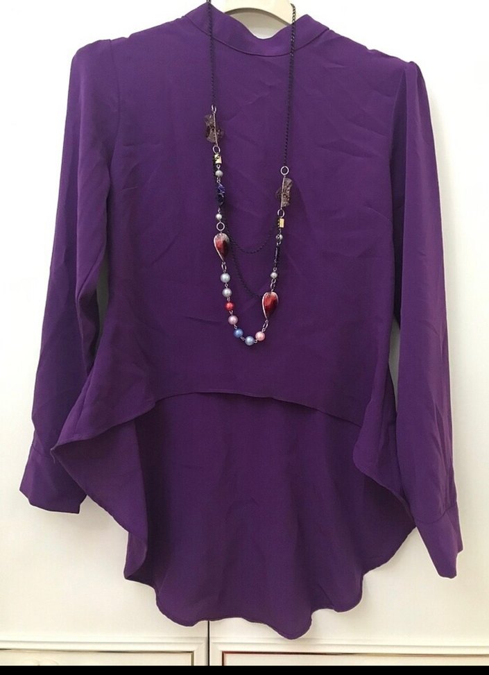 Uzun kollu, yüksek yakalı, boncuk detaylı mor kadın bluz. İpek gibi dokusu ve bol kesimiyle bohem stile uygundur. Bi tanesinin düğmesi düşmüştür