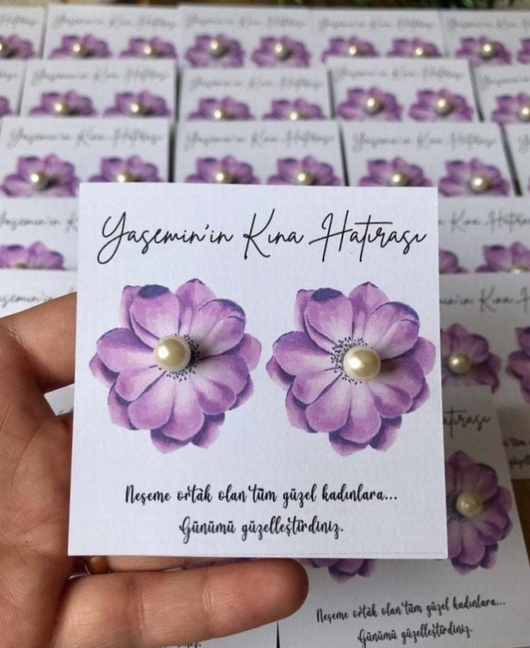 Boncuklu inci detaylı, mor çiçek desenli kadın kol düğmeleri. Bohem tarzda, pastel ve ışıltılı, düğünler için uygun. Üzerinde 'Haras' yazısı bulunur.