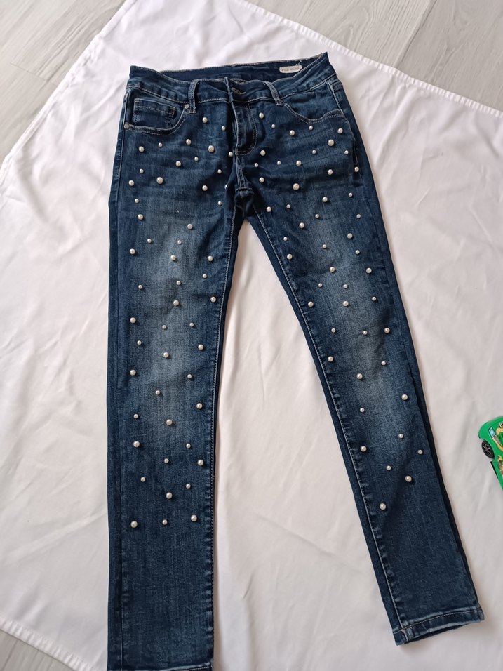 Renkli nakışlı ve boncuk detaylı, normal boy ve regular fit mavi kot pantolon. Günlük rahat kullanıma uygun.