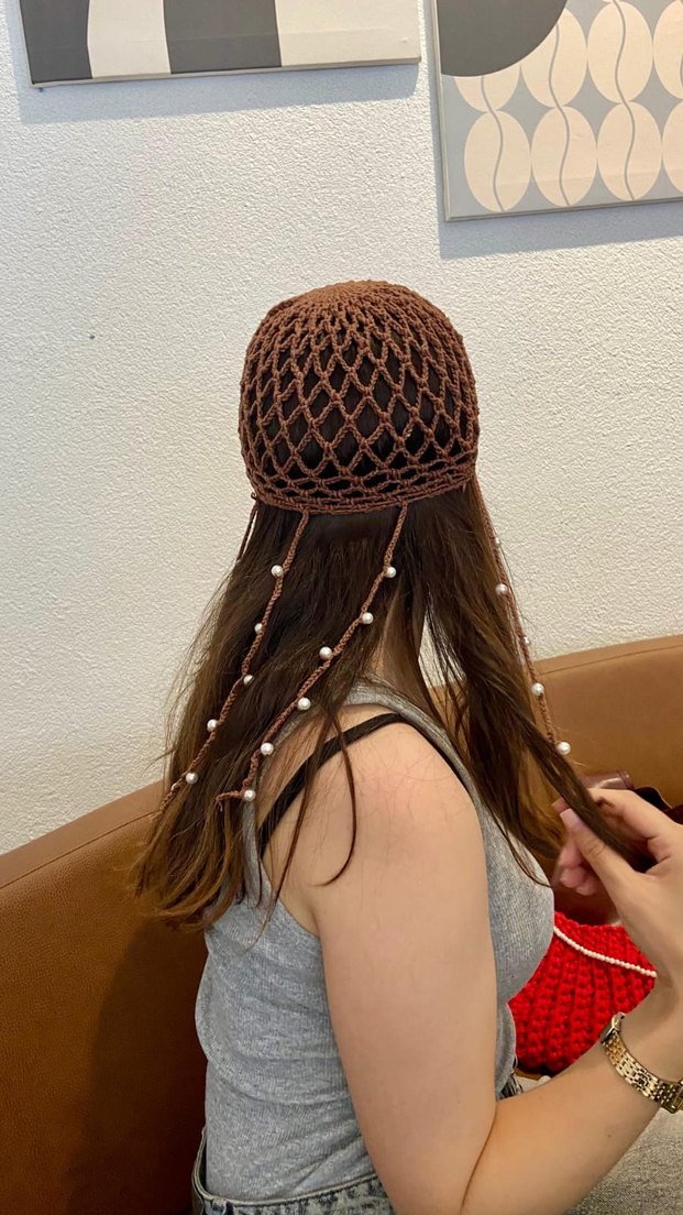 Boncuklu iplerle süslenmiş kahverengi örgü bohem kadın şapka, retro ve hippie tarzı yansıtıyor. Açık örgü deseniyle dikkat çekiyor.