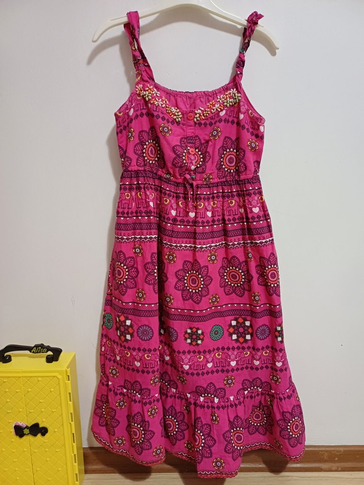 Renkli tie-dye desenli, boncuk detaylı, askılı ve straplez yakalı, bol kesim pembe bohem kız elbisesi. Yumuşak dokulu tekstil kumaştan üretilmiştir.