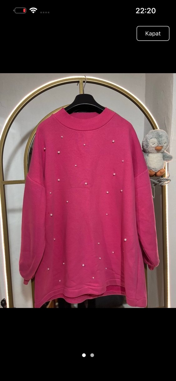 Pembe renkte, uzun kollu ve yuvarlak yakalı kadın sweatshirtü. Yumuşak ve sıcak kumaştan, boncuk detaylı, rahat ve midi boyda.