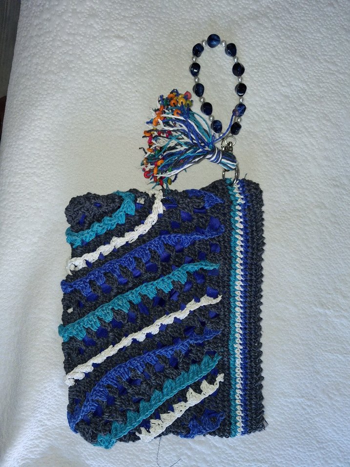 Boncuklu sapı ve bohem tarz püskülü olan renkli örgü kadın portföy çanta, günlük kullanım için uygundur.