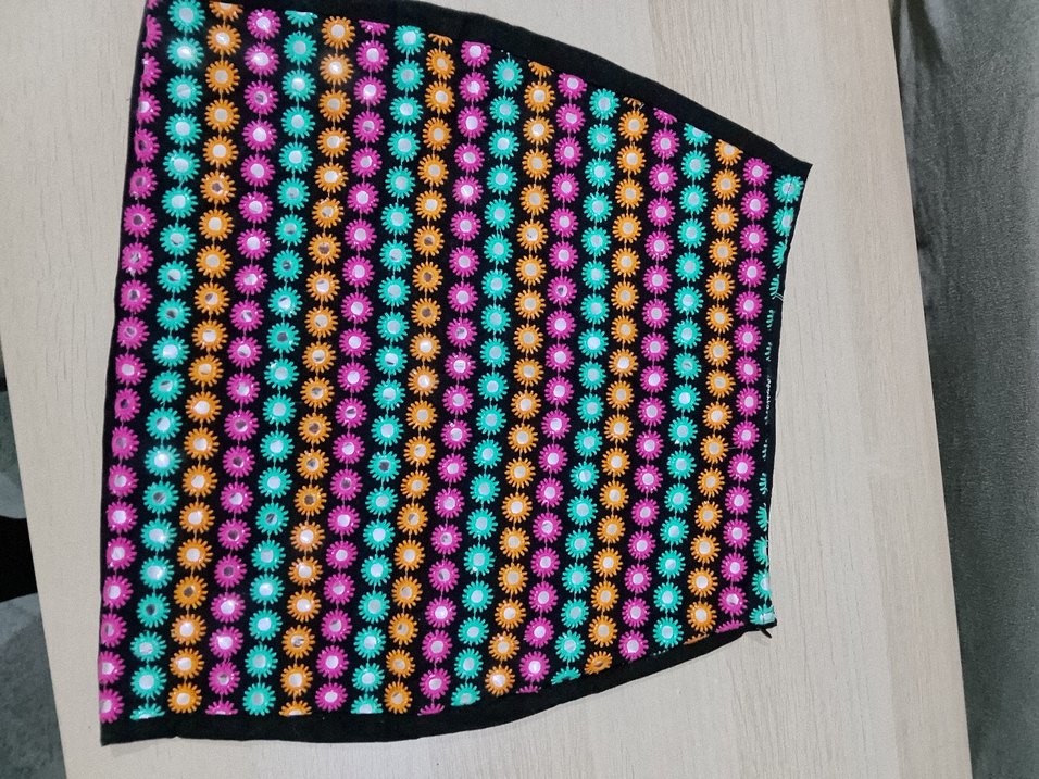 Boncuk detaylı, renkli ve desenli, sentetik kumaştan yapılmış bohem ve retro tarzda