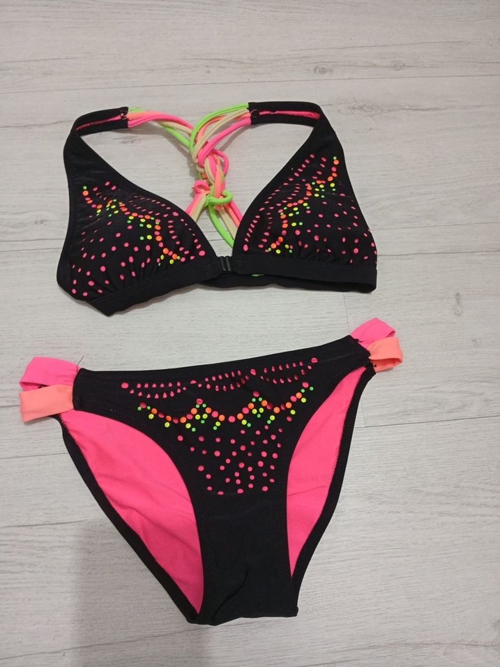 Boncuk işlemeli, renkli baskılı ve askılı tasarımlı, pembe renkli, kadınlar için fit bikini. Göğüs kısmı inanılmaz güzel duruyor kaldırıyor alttan göğüsü küçük olanları büyük gösteriyor.