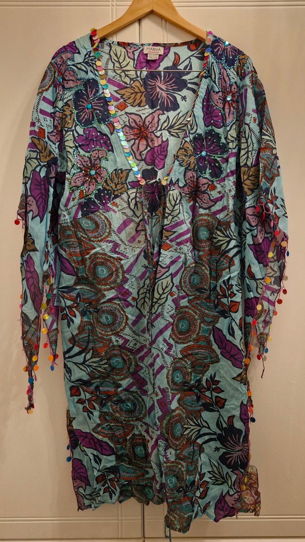 Renkli çiçek desenli, boncuk detaylı, V yaka ve uzun kollu, bol kesim uzun bohem kimono.