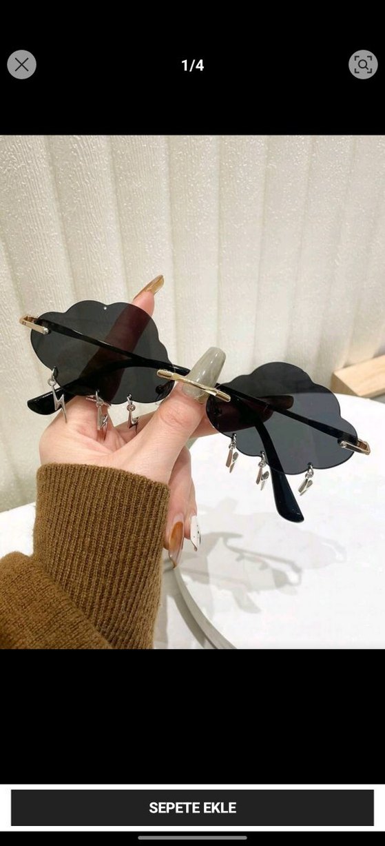Boncuk detaylı, bulut şeklinde siyah camlara sahip minimalist goth tarzda güneş gözlüğü, gri vurgularla.