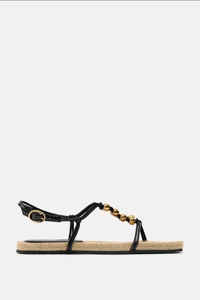 Boncuk detaylı, parlak siyah sandalet, yılan desenli, kauçuk tabanlı, plaj için uygun.