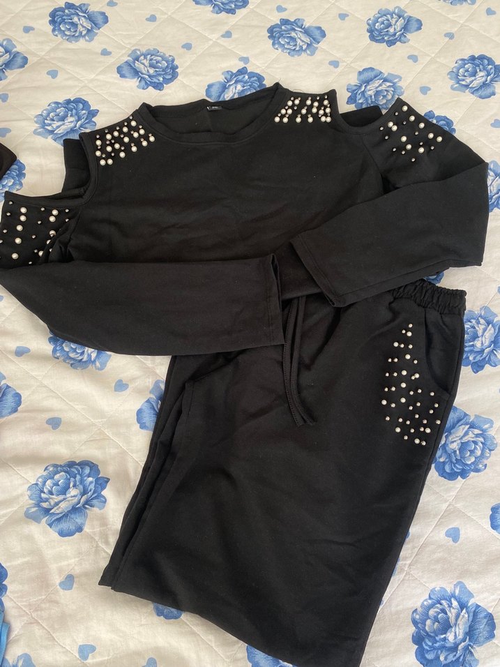 Siyah, boncuk detaylı kız eşofman takımı, bol kesim, yuvarlak yaka ve uzun kolludur. Omuz ve ceplerde boncuk süslemeleri bulunur, yumuşak sentetik kumaştan üretilmiştir.