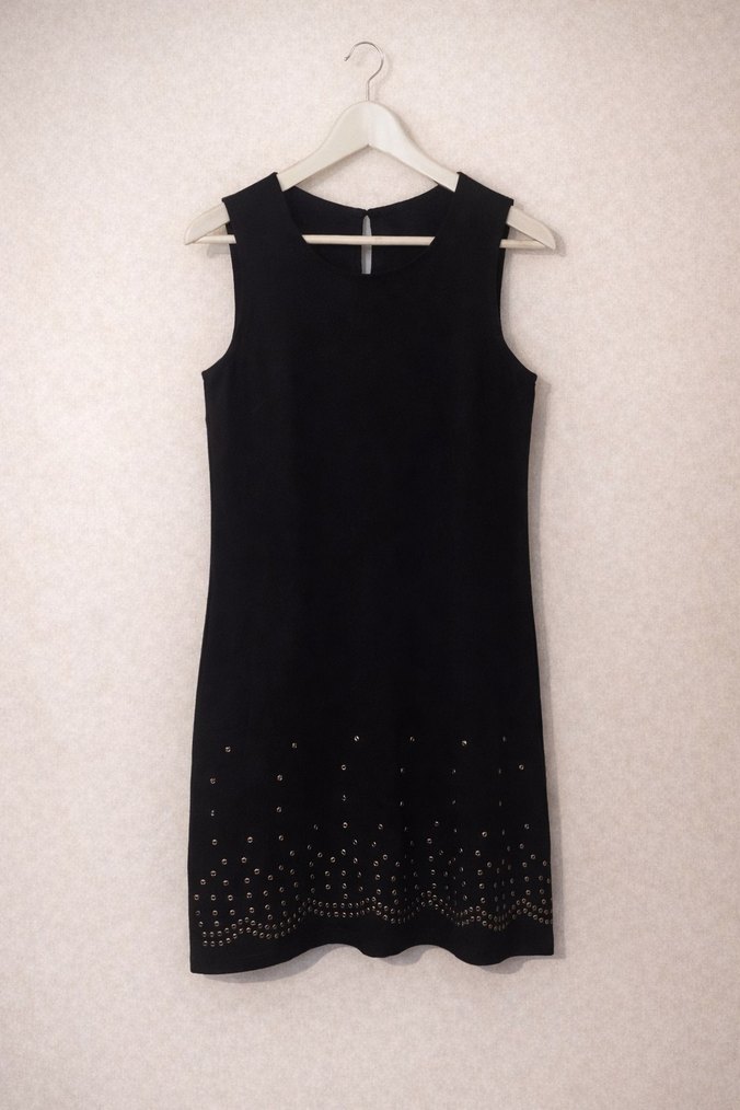 Siyah, kolsuz, midi boy ve boncuk detaylı, minimal goth tarzında, vücuda oturan elbise. Davetler, akşam yemekleri ve özel günler için çok uygun bir modeldir.
